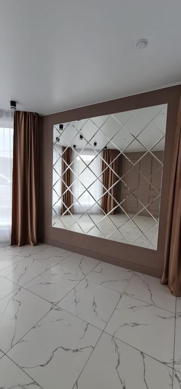 Как видим, и света и места в этой комнате более чем достаточно. Тем не менее, зеркальное панно здесь очень уместно. Все дело в том, что стилистика комнаты достаточно строгая и интерьер выглядит немного безжизненным. Искру ему дает как раз панно из зеркальной плитки, благодаря которому комната оживляется и выглядит жизнерадостно.